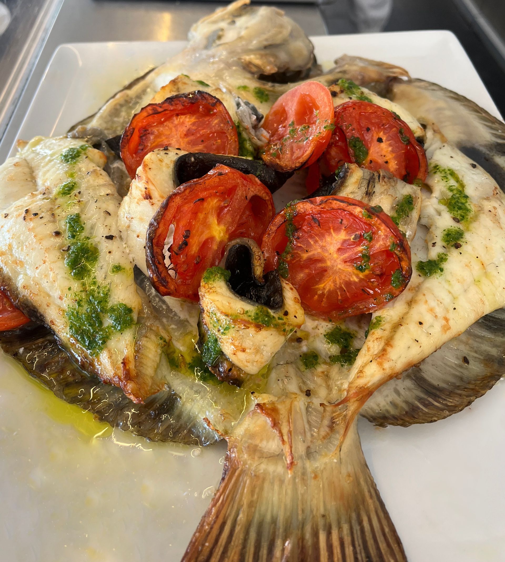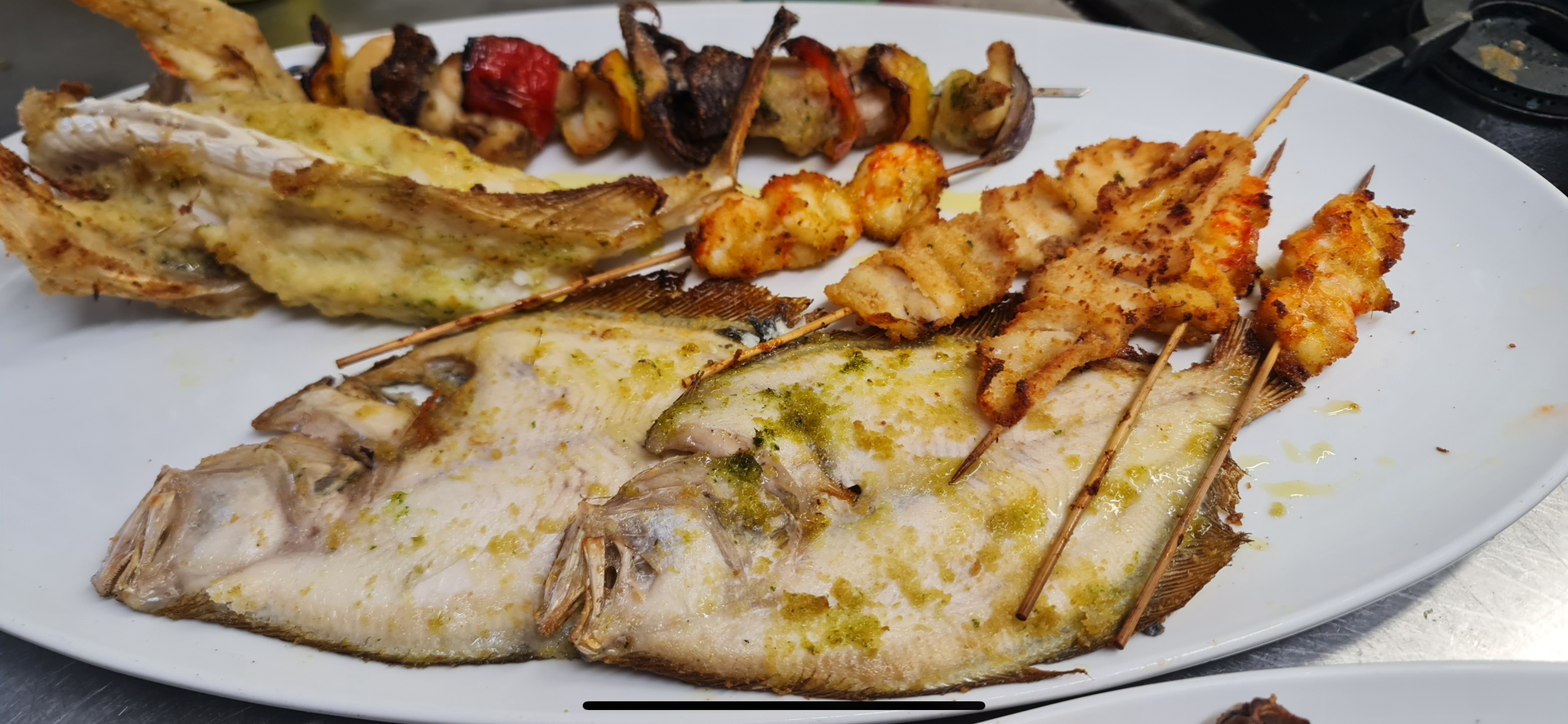 (Triglie, Sardoncini, Zanchetti, Moletti, Gamberi e calamaretti con verdure)